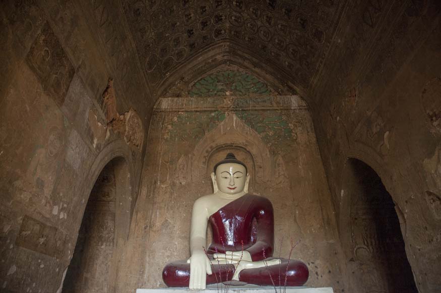The next day, I woke up and had breakfast. I started my adventure on electric bicycle around Bagan, and circled the main loop. I was having an absolutely boring time due to exhaustion from the previous trek to Golden Rock, and I had just finished a 11 day detox cleanse where I basically hadn't eaten any solid foods for 7 days. So my energy wasn't high. I'm so tired I just want to regenerate, but I don't want to miss the time here either. I want to go deeply into Bagan because it's so well preserved, but the magic also seems to be sold to tourists and I'm not impressed. I feel like waiting for sunset to get photos, or needing a tour guide to take me to the best places. My dream was to explore and get lost, wandering from temple to temple. I felt overwhelmed and not knowing where to go. I had to just go slow. I had time if I want it. The e-bike was totally uncomfortable. I need rest and meditation but I'm drinking a latte. After riding around for several hours I became impressed. I pressed some gold leaf on the hearts of the buddha's in the Ananda temple. I rode around marveling at the brick temple construction. I walked through halls and halls of Buddhist temple art. I squeezed through cooridors and felt the nail polish of fingernails bigger than my head. I asked the locals which temples were the most beautiful and followed the map. The insides of the temples were even more beautiful than I had imagined.