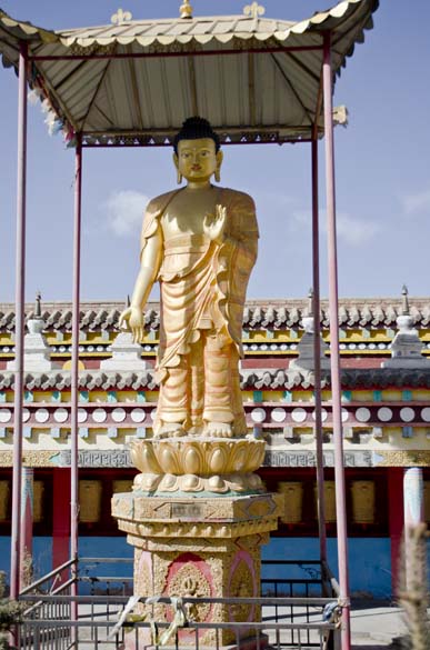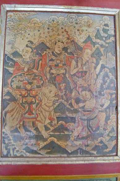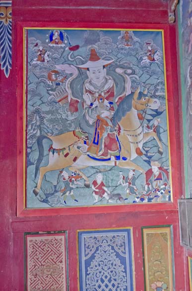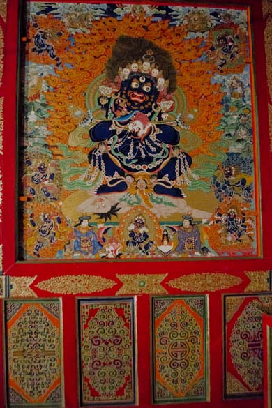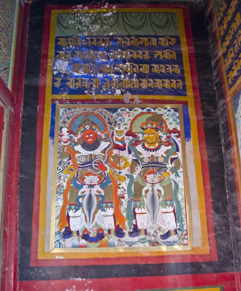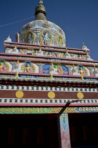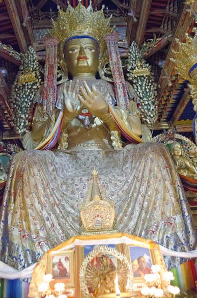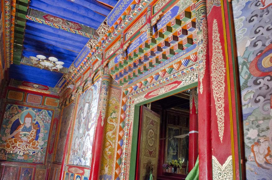 The temple for Tsongkhapa, a prominent teacher from the Gelug school of Buddhism, was especially ornate, with a three small tiers to the temple building, each a different layer of paintings, reaching to the top of the 30-40 foot deity which had a small photograph of the Dalai Lama enshrined on his lap. Tsongkhapa (1357-1419), was a buddhist scholar who led a renaissance of Buddhist teachings, and is regarded as a reincarnation of Avalokiteshvara, Manjushri, and Vajraprani and yet did not display any magical powers yet advocated for teachings of pure virtue and lived his life as a role model. The dieties of Maitreya, future Buddha, or Avaloktisvara, the Goddess of Mercy, were studded with gems and embossed with several metals, and the elaborate story paintings of Guru Rinpoche, and sophisticated decorations created contained spaces for meditations and spiritual experience to manifest itself in the heart. Multicolored quilted silk decorations hang from the tall ceilings nearly touching the meditators. I walked slowly through the area from smaller temples to the bigger temples up to the top of the hill, following endless lines of prayer wheels to spin as I walked. Every pillar covered in cloths and paintings. Through stairwells up to the rooftops, circumambulating the deities at the top of the temples, being blessed by tiny Buddha's hiding in all corners and levels of the complex.